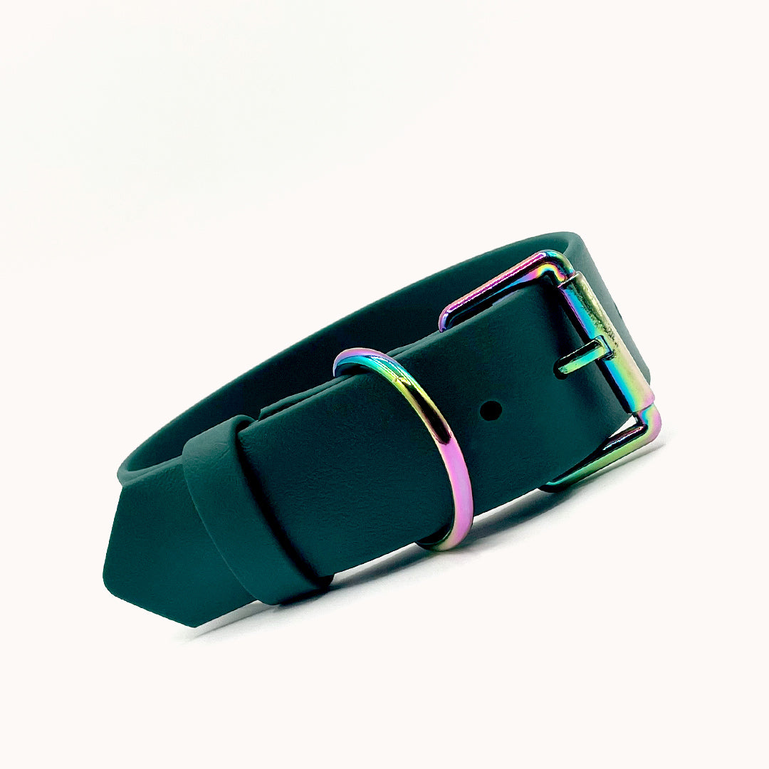 Adjustable BioThane collar. Width 1 1/2 inch (37mm), black hardware and buckle or rainbow hardware and fir buckle.