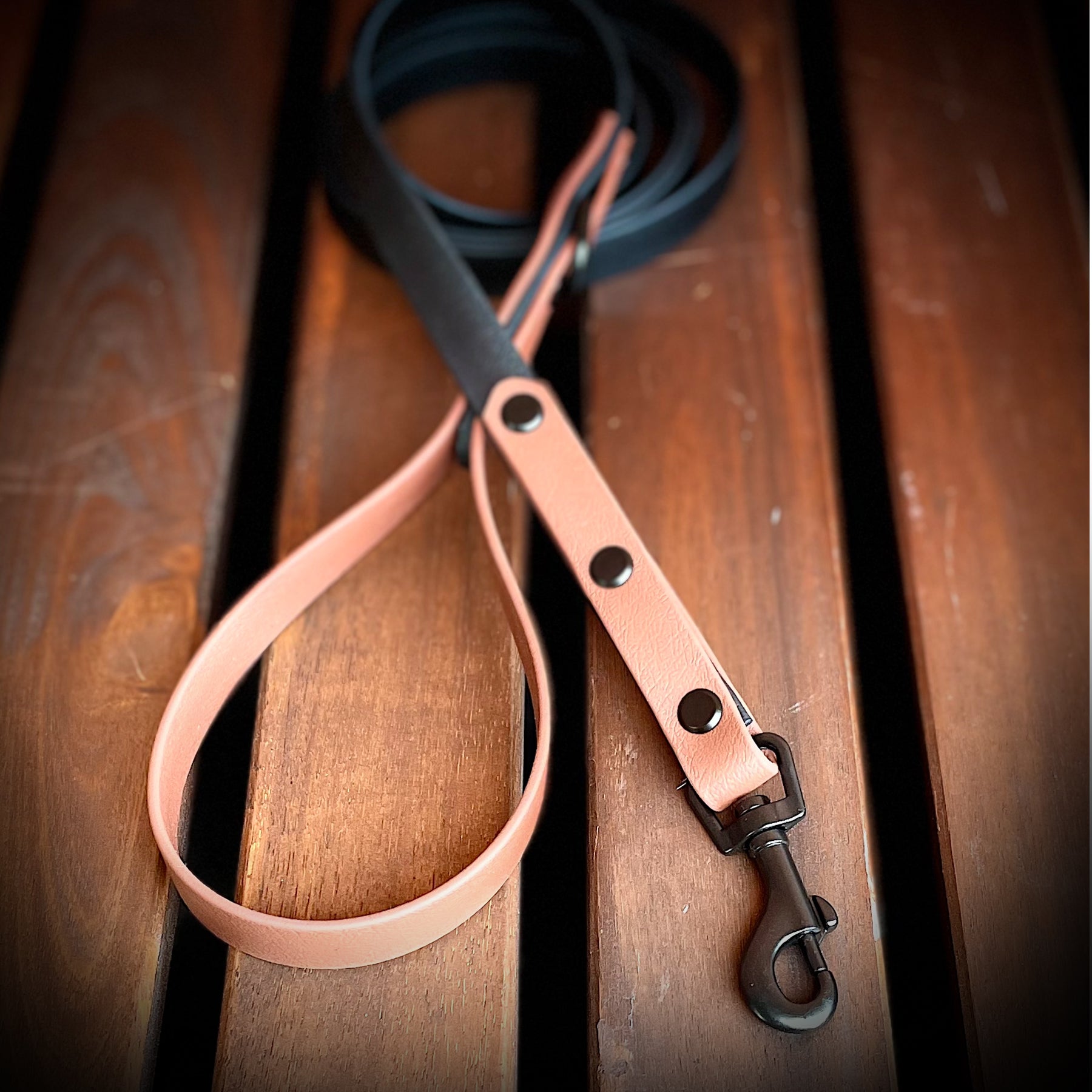 Single BioThane leash 5/8 inch wide x 6 feet long handmade. Black and pale brown. Recommended for smaller dogs. Perfect match with the double pirate necklace.